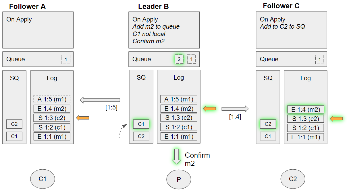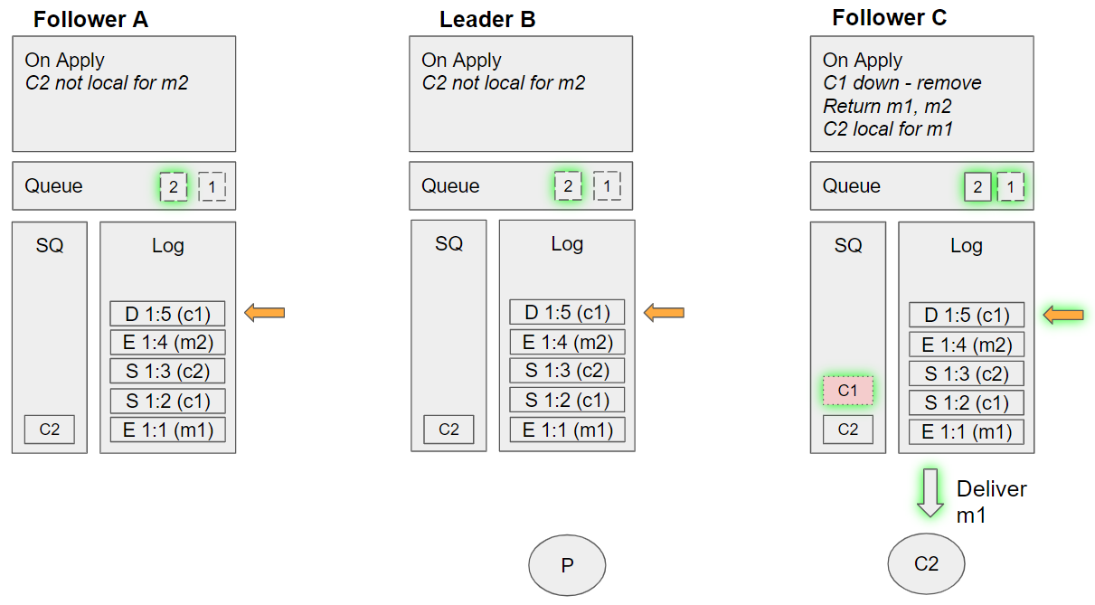 2. Follower C takes the next undelivered message, m1. Dequeues C2 from its SQ, and sees that C2 is local. Sends m1 to this local channel, requeues C2 on the SQ.