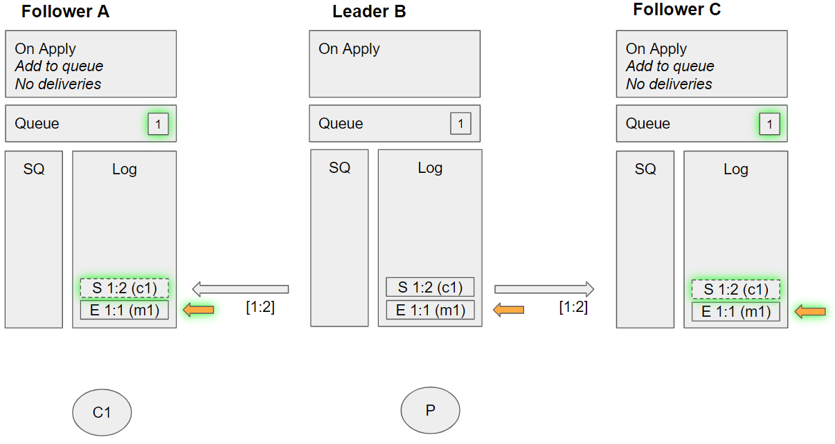 1. Removes the message from its queue *Follower C applies the enqueue m2 command: